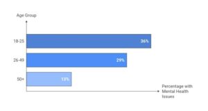 - In adults aged 18-25, 36% were reported to have any type of mental health issue